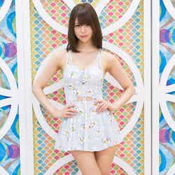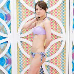 続くテーマは「女の子らしさ全開!ガーリー水着」。トップバッターで登場した坂本くるみは、シフォンオフショル花柄ビキニで登場。ロマンティックなシフォン素材のオフショルダーブラと、フリルをあしらった花柄のボトムは、今年No.1のモテビキニ。
