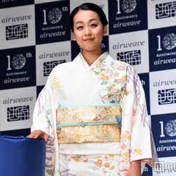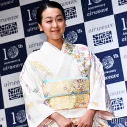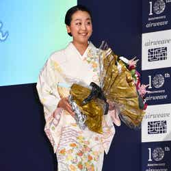 同ブランドアンバサダーを務めている浅田は、発売10周年を祝福するため艶やかな着物姿で登場。手に持った花束を関係者に手渡した。
