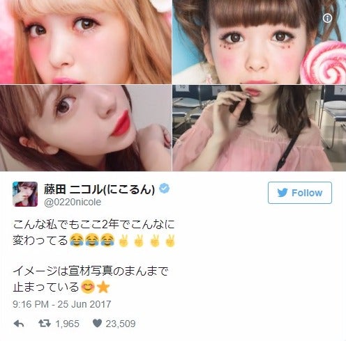 雑誌「Popteen」モデルでタレントの“にこるん”こと藤田ニコルが25日、自身のTwitterにて2年間での自身の外見の変化を披露した。