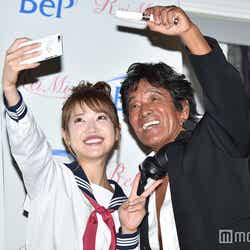 女子高生に扮してイベントに登場したくみっきーは「私は(昔)ギャルだったんですけど、久しぶりにつけまつげを付けてきたので、気分が上がっています」と声を弾ませ、制服については「学生の頃はブレザーだったので嬉しいです。このままディズニーランドとかに行きたいです」とニッコリ。一方、50年ぶりに学ランを着たという松崎は「いいものですね。体的にももっと若さを取り戻せたらいいんですけど、この歳にしたら若い方ですからね」と話し、くみっきーから「めちゃくちゃカッコいいです。『第二ボタンください』って言いたくなりますもんね」と言われると、「俺は第二ボタンを4つくらいあげましたよ。そういう学生時代の思い出は数多くあります。芸能界でも昔みなさん(報道陣)がうるさくなかったことの話題もいっぱいありました」とモテエピソードを明かした。イベントでは、同ライトを使った自撮り実演が行われ、自撮りの師匠としてコツを求められたくみっきーは「ちょっと上から撮ったほうがいいですね。顔がシュッと見えるので小顔効果もありますし、目も大きく見えます」と紹介。松崎から「恋人撮りをしよう」と提案されたくみっきーは、その誘いに応じて松崎と密着して写真に収まり、松崎を喜ばせた。