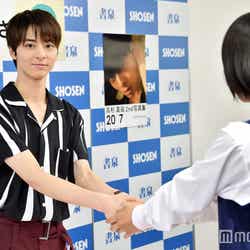 無事にケーキを倒すことなく撮影を終え、ホッとしたのもつかの間、一瞬の気の緩みからか生クリームが手にベッタリ…。「あっ…」と呆然と立ち尽くし、照れ笑いを浮かべる高杉に、和やかな笑いが起き、恥ずかしそうにティッシュで手を拭いながら「手を洗います(笑)」と高杉。「初めての握手会なので、実感がないというか。どんな風に握手するのかもわからない(笑)。どんな感じなんだろう。たくさんの人に来ていただきたいです」と期待と緊張の入り交じる想いを明かしつつ、ファンとの交流に臨んでいた。