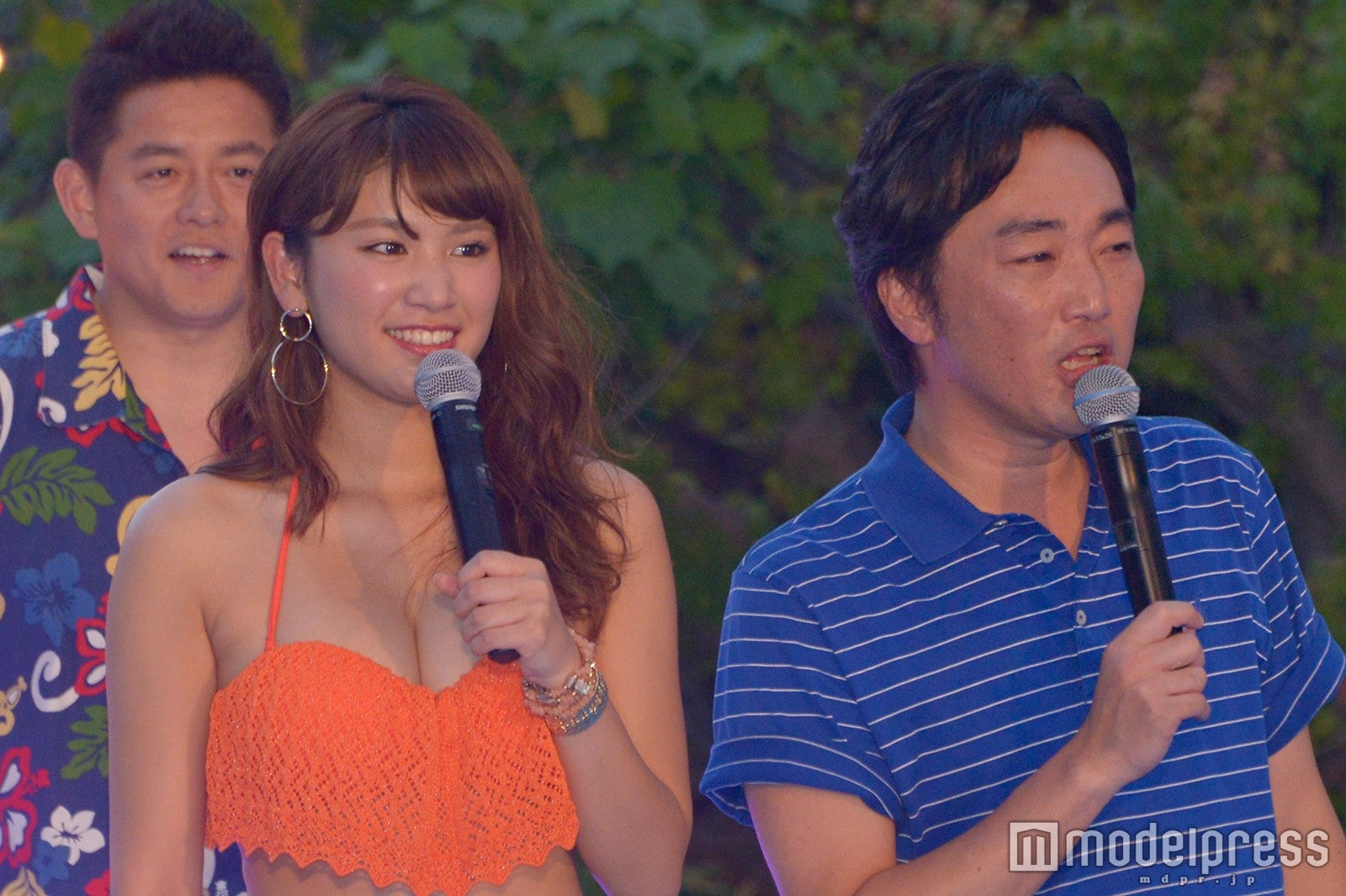 そして、久松は水着を着て登場すると、スピードワゴンを従えてブルゾンちえみ with Bの決めポーズを披露。まさかのコラボに会場から大きな拍手が起こった。その後、久松・chay・スピードワゴンの掛け声とともに、美女たちが入水。プールではしゃぐ美女たちを前に、井戸田は「いい景色だな」と興奮していた。