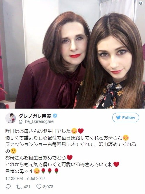 モデルのダレノガレ明美が7日、自身のTwitterにて母親の誕生日を祝福し、2ショットを公開した。
