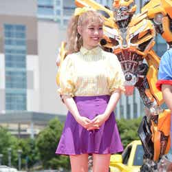 また、劇中に登場するオプティマスプライムをイメージした衣装で登場したりゅうちぇるは、「オプティマスのすっごい格好いい、強い感じの色合いを表している赤と青を取り入れて、強そうな機械と仲良くできる感じの“つなぎ”を合わせてみました」と紹介。バンブルビースタイルのぺこは「バンブルビーの格好良さを出すことは難しいので、黄色をメインに女の子版バンブルビーを目指しました」と説明した。さらに、発売前の貴重な車に乗って登場し、「めっちゃ興奮しました。こんなに格好いい車に乗ったことがなかったので、凄い嬉しかったです」と声を弾ませたぺこ。りゅうちぇるも日本に2台しかない車に「8メートルくらいの高さから見る景色が全然違くて興奮するぅ」と高さを盛りながら(実際は2メートル)、感想を嬉々として語った。
