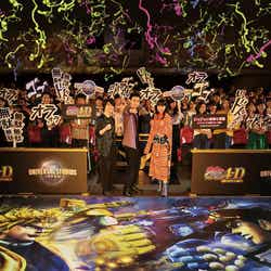映画『ジョジョの奇妙な冒険 ダイヤモンドは砕けない 第一章』(8月4日公開)に出演する山崎賢人(※「崎」は正式には「たつさき」)、神木隆之介、小松菜奈が19日、ユニバーサル・スタジオ・ジャパンにサプライズ登場。特別に招待された約200人のゲストとともに人気アトラクション「ジョジョの奇妙な冒険・ザ・リアル 4-D –DIO の世界-」を体験した。