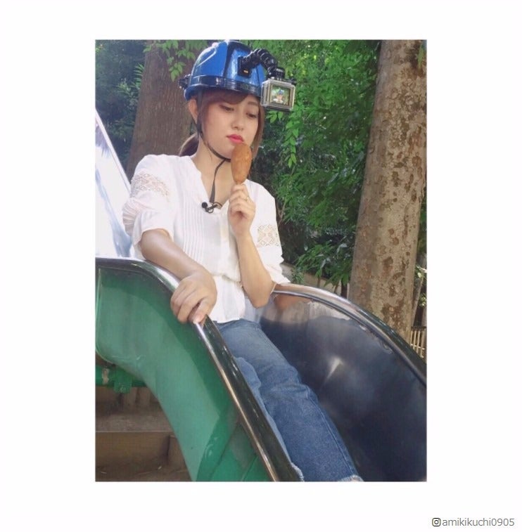 菊地は、カメラ付きヘルメットを被りアメリカンドッグを持ちながら、滑り台のようなものに座っている写真を公開。