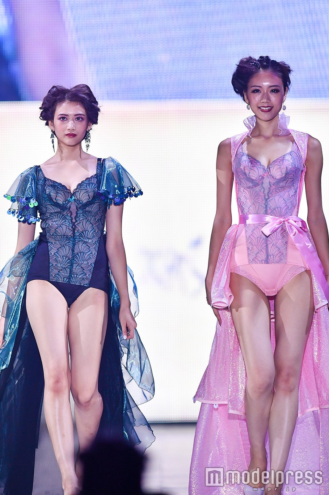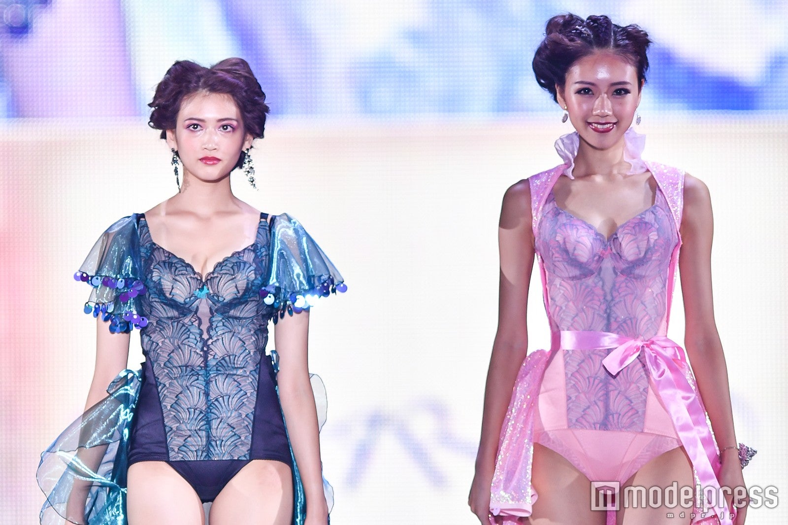 「Body Make Lingerie MARUKO」ステージにて、木津はモデルの渡邉みさきとともに華やかなランジェリー姿で登場。