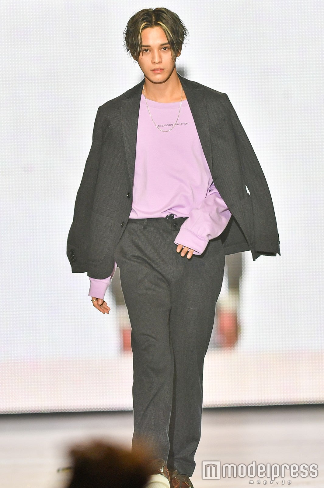 「BENETTON」ステージに登場した3人。現在放送中の連続ドラマ「ウツボカズラの夢」(フジテレビ系、毎週土曜よる11:40~)にも出演し、俳優として今後注目の上杉は、グリーンのトップスを主役にした個性的なファッションを着こなし。長身を活かし、アパレルブランドのイメージモデルなどの活動も行う彼らしい、スタイリッシュなランウェイで観客を沸かせた。