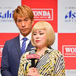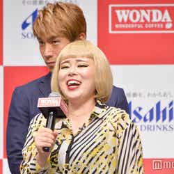 お笑い芸人のブルゾンちえみ withBが6日、都内で行われた新CM発表会にビートたけしらと登場。金髪姿を披露した。