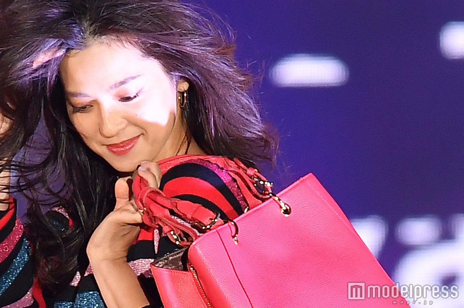 「Samantha Thavasa」ステージに、ビビットカラーのストライプとボーダーのセットアップを着こなし登場。
