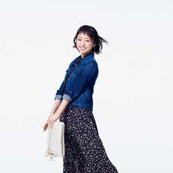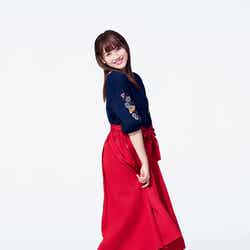 守屋はネイビーに花柄の刺繍が施されたトップスに鮮やかなレッドのロングスカートを合わせたガーリーなコーディネートを着こなし、「このトップスは流行りの花柄の刺繍が取り入れられていて、このスカートは後ろが長い丈感になっていて、シルエットがすごくきれいに見えるものを選びました。あとは秋なので暖色」とポイントを解説。