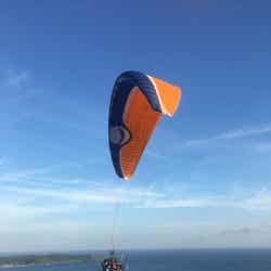 最後は、モーターパラグライダーに乗って大空から夕陽の撮影に挑戦。青い空と青い海と、沖縄を満喫する。(modelpress編集部)