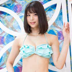 山本成美は爽やかなライトブルーのフリルバンドゥビキニを着こなし。ブラのVゾーンから谷間をチラリとのぞかせ、抜群のプロポーションを惜しげもなく披露した。八鍬有紗はブラジリアンビキニで美ヒップラインを強調。ボトムは大きなリボンの腰ひもデザイン、トップはマーメイド型で流行をしっかりキャッチ。小麦肌にぴったりなセクシーな着こなしを披露した。