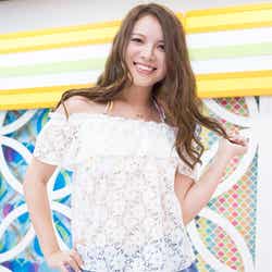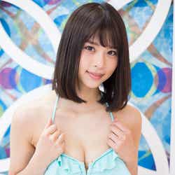 八鍬有紗はブラジリアンビキニで美ヒップラインを強調。ボトムは大きなリボンの腰ひもデザイン、トップはマーメイド型で流行をしっかりキャッチ。小麦肌にぴったりなセクシーな着こなしを披露した。