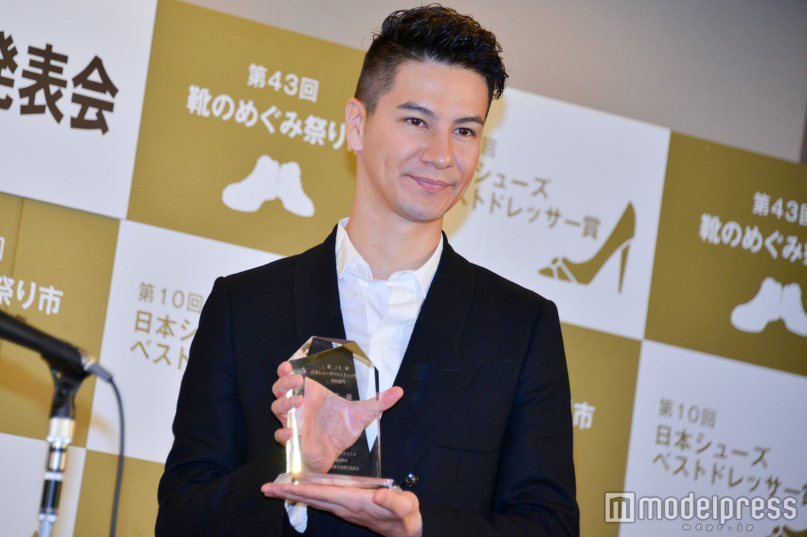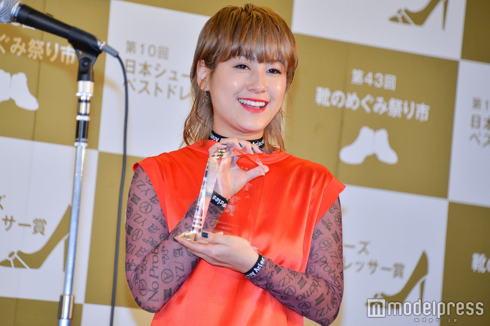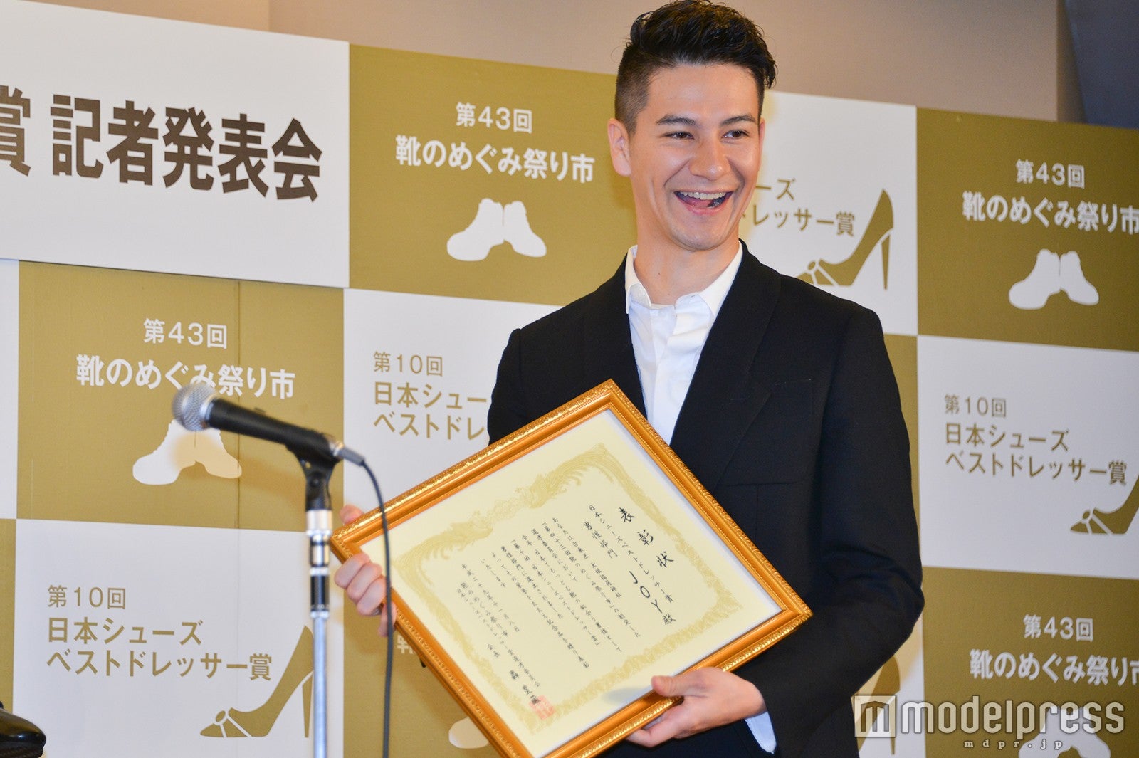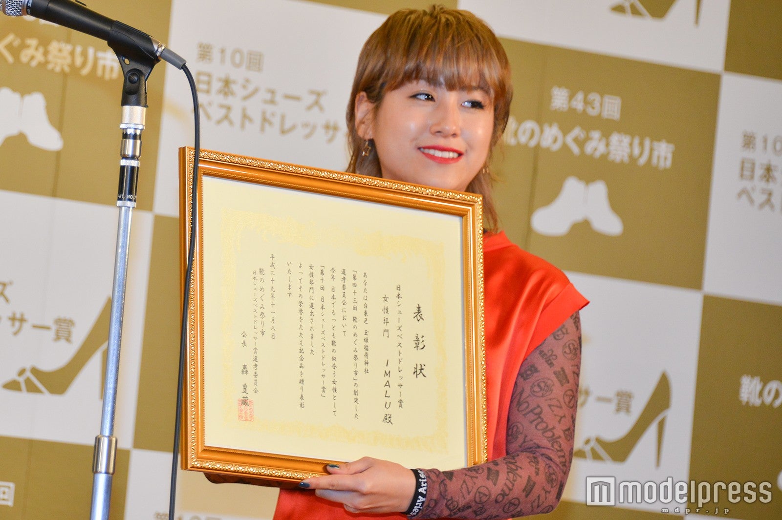 同賞は、経済産業省の支援を受け、皮革製品日本一の生産量を誇る台東区の清川にある玉姫稲荷神社で、近隣の靴関連業者が地域産業の発展と日ごろの感謝を込めて開催する「靴のめぐみ祭り市」(今年は11月25日、26日)の特別企画として行われているもので、2008年から毎年、その年もっとも靴が似合う、日本の革靴を美しく履きこなせる著名人を選出。今年は「男性部門」でJOY、「女性部門」でIMALU、「シニア部門」で俳優の名高達男、記念特別賞を歌手のReinaこと奈月れいが受賞し、4人が登壇。自身でデザインした靴をプレゼントされた。