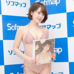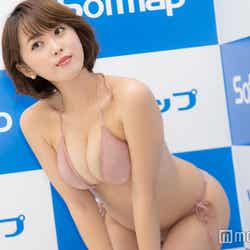 今作では、透き通るほどの綺麗な肌に食い込む10種類の極小ビキニ姿を披露。撮影は2ヶ月ほど前に鎌倉で行ったそうだが、「元々撮影を予定していた日が台風で中止になってしまって、変わった日も雨で…(笑)」とハプニングもあったよう。「一瞬雨が止んだ時に外で撮影したんですけど基本は室内です」と紹介した。また、着用した水着については「いつもとあまり変わらないけど、和柄の水着は初めて着ました」とニッコリ。オススメの写真を聞かれると「実は出来上がったものを初めて見るんです(笑)」と迷いながら、「今回はセクシーっていうよりも爽やかな明るめな感じが多いですね」とアピールし、「このぐらいの期間から髪が伸びてきて、やっと癖っ毛っぽいカットが出来るようになったんです」と嬉しそうに明かした。