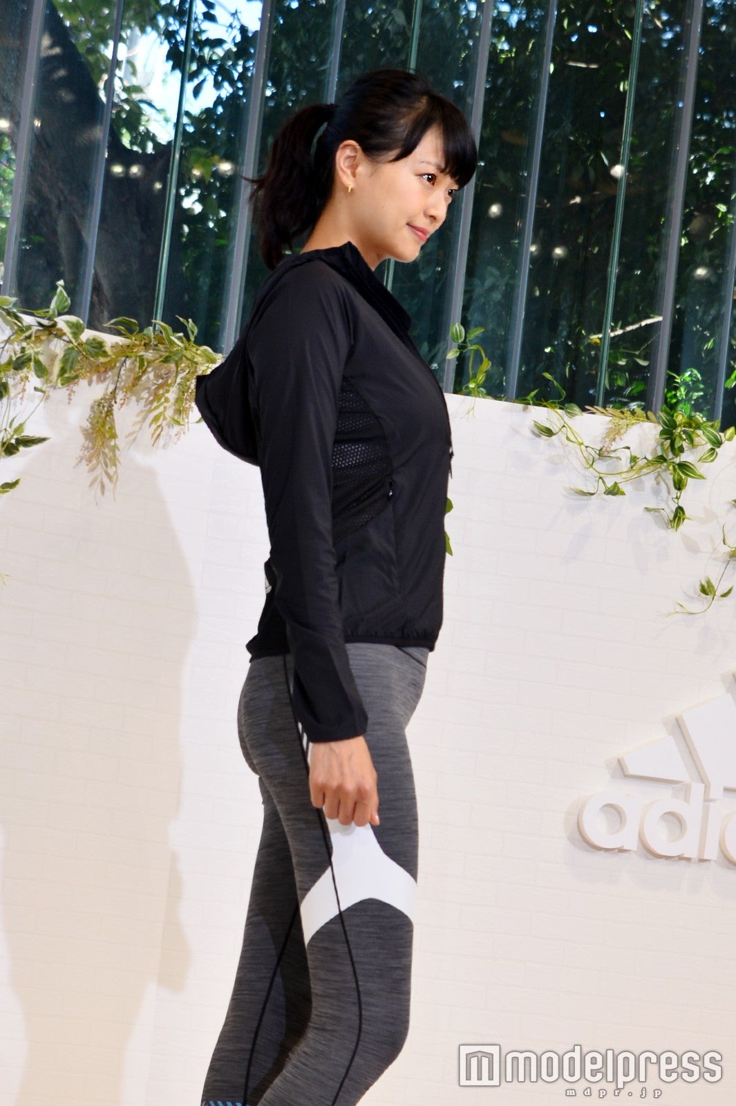 スレンダーなボディラインがはっきりと分かるグレーのトレーニングウェアにブラックのパーカーを合わせ登場。産後とは思えぬ美ボディを披露した。