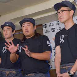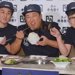焼肉チェーン店の新CMに出演する3人は、焼肉店員の制服姿で声を張り上げなら登場。秋山が様々な“クリエイター”に扮する企画「クリエイターズ・ファイル」が人気を集めているが、この日は3人で焼肉店員になりきった。バイトリーダーの秋山は、山本と馬場に的確な指示出し。「ひたすら焼いてくれ」と命じられた馬場は報道陣のために絶妙な焼き加減で肉を焼き続け、山本はフロアを行ったり来たりしながら料理を運び記者をもてなしていた。