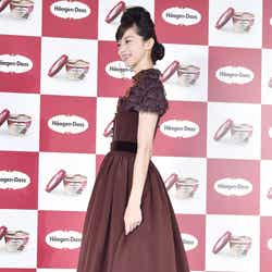 新商品にちなみ、本物のチョコレートをドレスの一部分に使用したオリジナルのチョコレートドレスを着用して登場した中条は、「ここ(胸元)のブローチの部分がチョコレートになっています」と紹介し「本当に美味しそうですね(笑)」と笑顔を見せた。