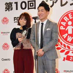 カップル部門で受賞に輝いた二人。太田は「このような素敵な賞をいただきありがとうございます」と感謝を伝え「トリオの中でも目立たない中ボケの私がこのような素敵な賞をいただけたのは、奥さんのおかげだと思っていますので、これからも大黒柱として奥さんにはがんばってもらいたい」と自虐気味に妻・近藤へエール。続けて「全力で捨てられないように素敵な家庭を築いていければと思います」と誓った。