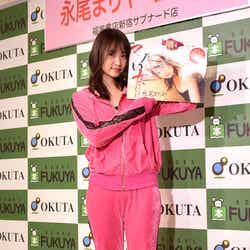 同カレンダーは、10,000枚を超えるカットから厳選した写真集『マブイ!まりや。』から、貴重な未使用カットをセレクト。“マブい女2018年度決定版”となっている。永尾は“マブい女”の象徴・ピンクのジャージ姿で登場。ファッションのポイントを聞かれると、「朝寝坊してそのまま撮影に来ちゃったよ」というイメージだといい、「なかなかこんなサンダル履かない」と造花があしらわれたサンダルを紹介。
