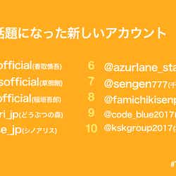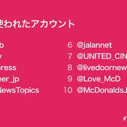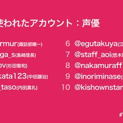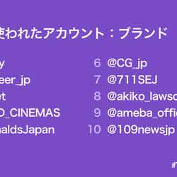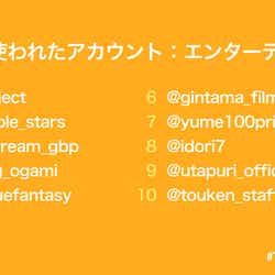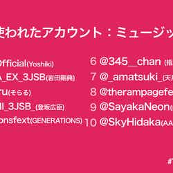 なお「もっとも使われたアカウント」の役者部門では広瀬すず(@Suzu_Mg)が1位に。ほか「24時間テレビ40 告白 ~勇気を出して伝えよう~」のチャリティーマラソンランナーで話題となったブルゾンちえみ(@buruzon333)らが続いている。(modelpress編集部)