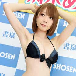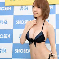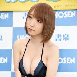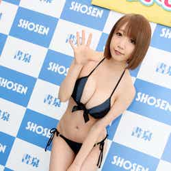 グラビアの先輩・今野杏南からもらったというブラックを基調とするビキニ姿で登壇した清水。フィギュア体型の悩殺ボディが最も強調されているシーンとして、ベッドの上で胸をかき上げている下着姿のカットを選び「今まで着た衣装の中でも胸が盛れる衣装でした」と気に入った様子を見せた。