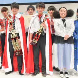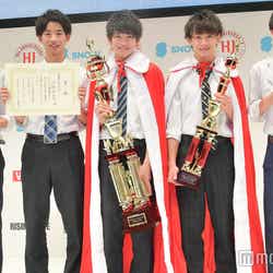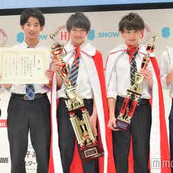 24日、都内にて“日本一のイケメン高校生”を決める「男子高生ミスターコン2017」全国ファイナル審査が開催され、埼玉県出身の高校2年生・高橋文哉(たかはし・ふみや)くんがグランプリ、黒田昊夢(くろだ・ひろむ)くんが準グランプリを受賞。イベント後、ゲストMCの岡田結実とニッチェ、昨年度グランプリの本田響矢、準グランプリの那須泰斗とともに囲み取材に応じた。