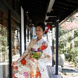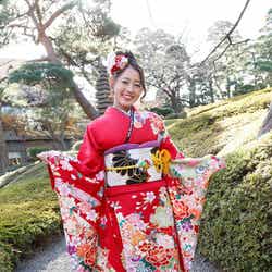 お気に入りは(胸元の)赤とゴールドのラインです。この組み合わせって派手になってしまうイメージなんですけど、お着物で着るからこその上品さが出ていて、このお着物だからこそできたのかなと思います」とにっこり。