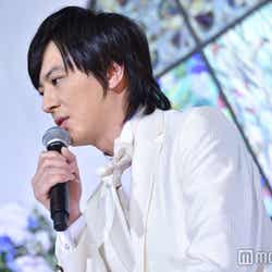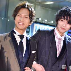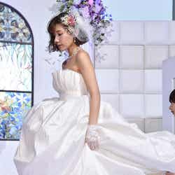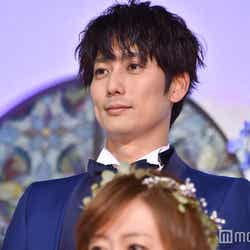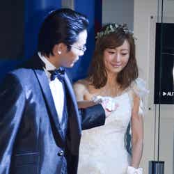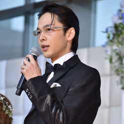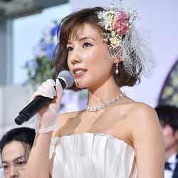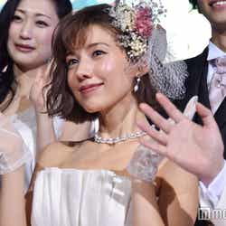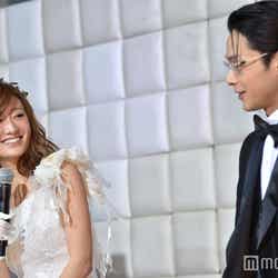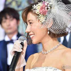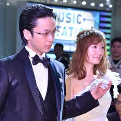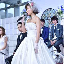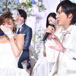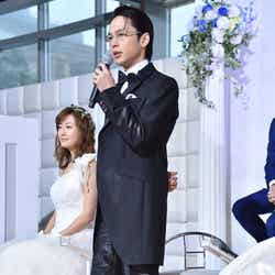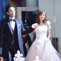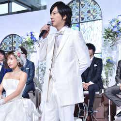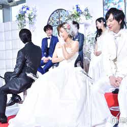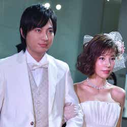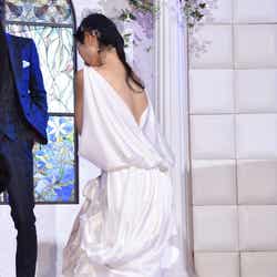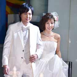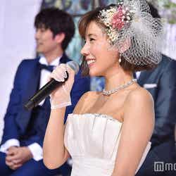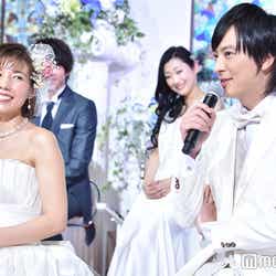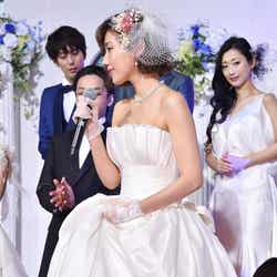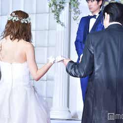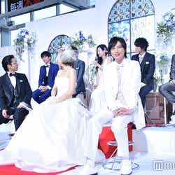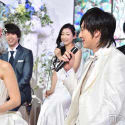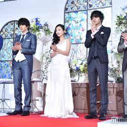 会見では夫婦役を演じる仲&塚本、松本&中村の2組がウエディングドレスにタキシードの結婚式さながらの衣装で登場した。
