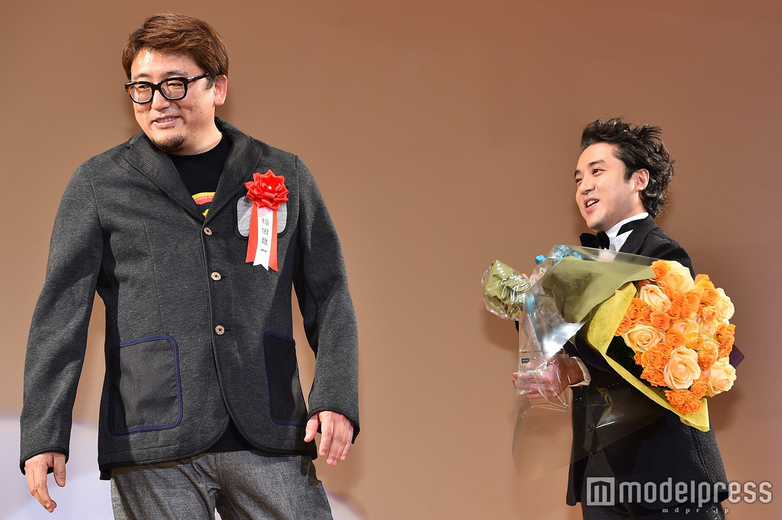 祝福ゲストとして「銀魂」「斉木楠雄のΨ難」などで監督を務めた福田雄一氏が登壇し、花束を贈呈。「5年後の大河、脚本かけると思います」とムロにのっかり、2人揃って「よろしくお願いします」と制作陣に呼びかけるなどさすがのコンビネーションを披露。終始会場を笑いに包んだ2人だが、最後には福田氏から「ムロくんは人を元気にできる役者。僕が死にたくなるほど落ち込むことがあって弱音を吐いたんですけどムロくんが『雄一さんが死んだら僕も死なないといけないので早めに教えて』と。本当に嬉しくて勇気になった」とムロとの感動エピソードを明かす場面も。2人の絆が垣間見えるスピーチに会場は拍手喝采となった。