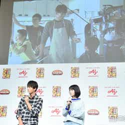 今回、竹内は7人大家族の長男、浜辺は長女として新CMに出演。CMでは妹役の浜辺が竹内演じる兄の「からうま!」という台詞を真似する一幕があり、浜辺は「食べるシーンも多かったんですけど、それ以上にテイクを重ねたのは『からうま!』ってお兄ちゃんの真似をする場面。コツは目を瞑って上を向いて、少し眉間にしわを寄せることです」と研究し、モノマネを習得した様子。竹内から「素晴らしいですよ。似てたんじゃないかなと思います。振り切っていて、さすが女優さんだなと思います」と絶賛を受けると、司会者から「ぜひ」と実演の流れへ。