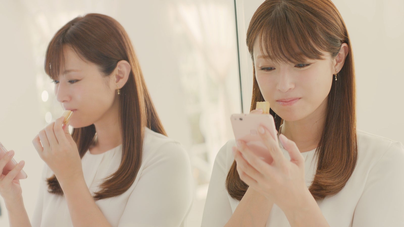 その後、「ふふっ、こんなときあったなあ」と鏡の前で写真と同じポーズをとってみる深田。やさしい笑顔が印象的な映像に仕上がった。