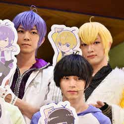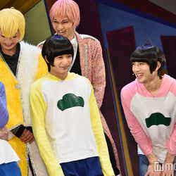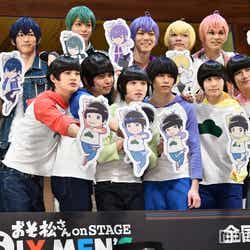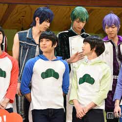 ゲネプロを前に6つ子を演じる高崎翔太(おそ松)、柏木佑介(カラ松)、植田圭輔(チョロ松)、北村諒(一松)、小澤廉(十四松)、赤澤遼太郎(トド松)、6つ子のイケメンver.=F6を演じる井澤勇貴(おそ松)、和田雅成(カラ松)、小野健斗(チョロ松)、安里勇哉(一松)、和合真一(十四松)、中山優貴(トド松)がマスコミ向けの囲み取材に参加。先月26日に大阪公演を終えており、井澤は「大阪はお笑いに少し厳しいので不安な点もありましたがキャスト全員、スタッフ陣の協力もあり見事にクリアできた」、高崎も「自分で言うのもなんですが“待ってました感”をひしひしと感じた」と手応えを明かす。「前回よりも色々ハチャメチャなことに挑戦しているので楽しんでもらえる」(植田)、「第1弾より確実に個々も全体も力強くパワーアップしている」(北村)と一言ずつ意気込みを語る中、赤澤の番になると突然高崎が「(記事の)見出し狙って、見出し!」と煽り、「見出しですか?!」と慌てた赤澤が「天下取れる舞台だと思います!」とブチ上げると「(笑)をつけといてください」と報道陣にお願いする高崎。続けて和田が「俺、脱ぎます!すごい脱ぎます!」と“肉食系肉”として筋トレの成果を見せると宣言、和合は「世界中のエンターテイメントを凝縮したと言っても過言ではない舞台です」と表現したあと「…過言でしたね」とすぐに訂正していた。