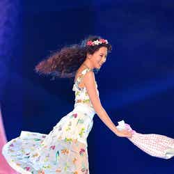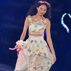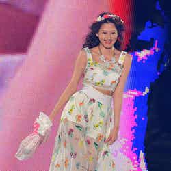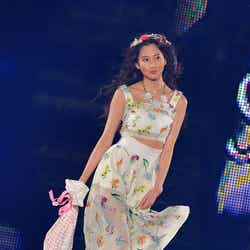 「SPIGA」ステージのトップバッターに登場。カラフルな花かんむりを乗せた河北は、花柄×シースルーファッションに身を包み、お腹をチラ見せ。