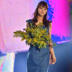 「JILL by JILLSTUART」ステージに登場した石川は、この春トレンドのデニムワンピースを1枚でサラッと着こなし。
