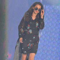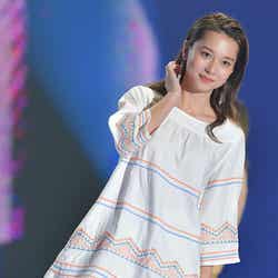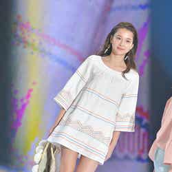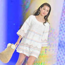 「Vicente」ステージではホワイトの刺繍入りミニワンピースでつややかな美脚をあらわに。カゴバッグを合わせたリゾート感のあるコーディネートでハッピーオーラを振りまいた。