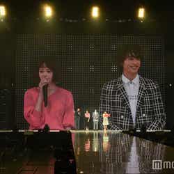 ピンクのVネックトップスにふわっとした黒スカートを合わせた玉城と、チェックのスーツを着こなした小関は笑顔でランウェイをウォーキング。