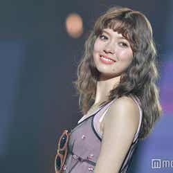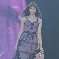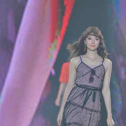 「dazzlin」ステージに登場した八木は、くすんだピンクのタンクトップに、黒のシースルーワンピを重ねたスタイルを披露。