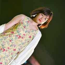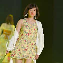 「rienda」ステージに登場した筧は、ミニ丈の清楚な花柄ワンピースを着こなし、美脚を披露。