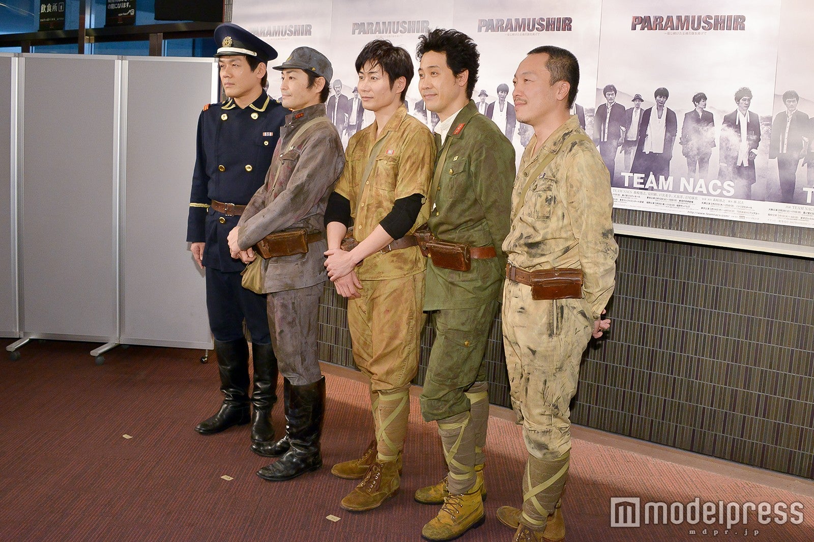 14日、俳優の森崎博之、安田顕、戸次重幸、大泉洋、音尾琢真の5人からなる演劇ユニット・TEAM NACSによる公演「PARAMUSHIR~信じ続けた士魂の旗を掲げて」の東京公演がスタートするにあたり、東京・TBS赤坂ACTシアターにて記者会見が行われた。