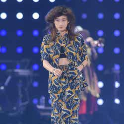 「MOUSSY」ステージにて、TGC初となる生バンド演出の中、登場した山田は前髪を大きくカールさせ、お腹を出したセパレートファッションでクールに登場。