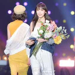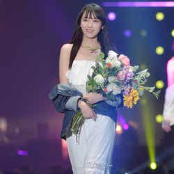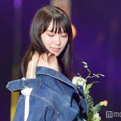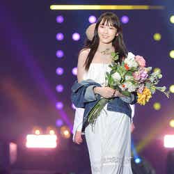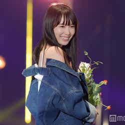 花束を持ち、清楚ガーリーな雰囲気で笑顔を振りまき、ランウェイ先端では投げキッスなどサービスたっぷりに観客のリクエストに答える瞬間も。溢れるハッピーオーラで会場を包んでいた。