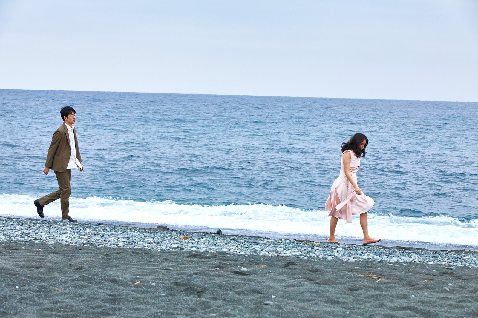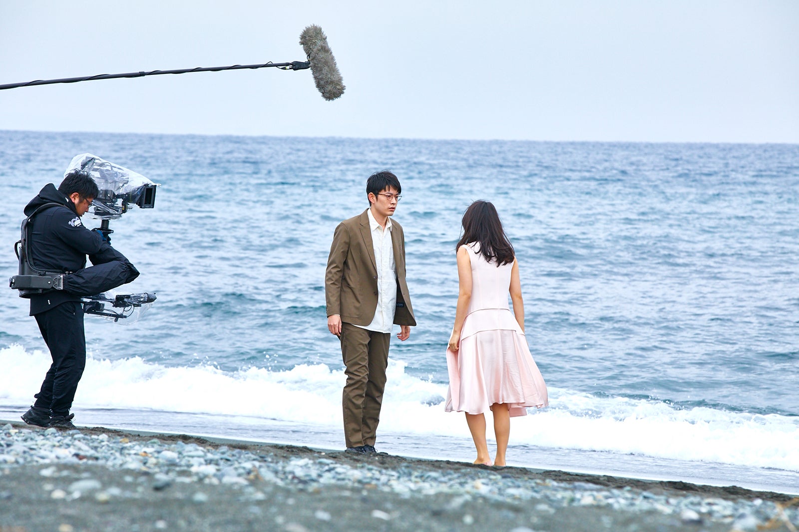 薄手のノースリーブワンピース姿でも寒そうな表情は微塵も見せず、時には裸足のまま波打ち際で足を濡らしながらも、迫真の演技を見せた。
