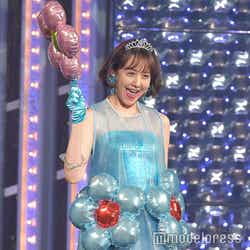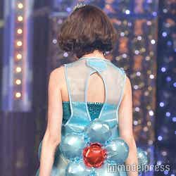 スカイブルーのチューブトップとミニ丈ボトムにシースルーワンピースをレイヤードした着こなしで、スラリ美脚を披露。腰につけたフラワー型の風船を手でも持ちながら、笑顔でランウェイを歩き、超満員の観客から声援を浴びた。
