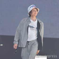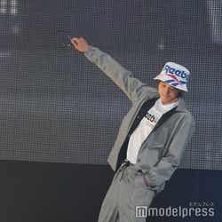 グレーのチェック柄セットアップにバケットハットをかぶったストリートなスタイルで登場すると、客席からは大歓声が上がった。