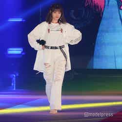 胸元に大きく「未来ガジェット研究所」と描かれたロゴTシャツに、ダメージボトムスを合わせたそのスタイリッシュな着こなしは、アニメ好きで、雑誌「CanCam」専属モデルを務める松村ならでは。ランウェイ先端ではプレゼントを投げ、普段通りのキュートな表情も。また観客に笑顔で手を振るなど、ファンサービスでも会場を沸かせていた。