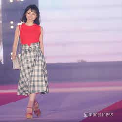 雑誌『ar』レギュラーモデルで同イベント初ランウェイの今泉は、赤のトップス、チェックのスカートの可愛らしいコーディネートで「dazzlinステージ」に登場。