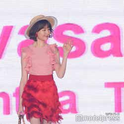 「サマンサタバサ」ステージに登場したトリンドルは、赤のギンガムチェックブラウス×ミニ丈フェザースカート、カンカン帽を被ったお嬢様風ガーリースタイルを着こなし。