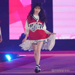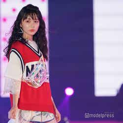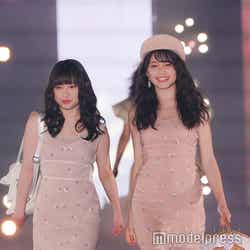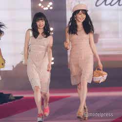 2人は「dazzlin」ステージに登場。ゆるふわパーマヘアにタイトなワンピースを着こなし、ガーリーなコーデを披露した。